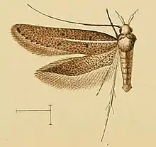 The wingspan is about 12 mm. The forewings are pale cinereous densely sprinkled with fuscous. The hindwings are dark tawny brown.[2]