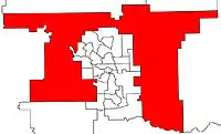 Chestermere-Rocky View was created from large portions of the old electoral district of Airdrie-Chestermere and Foothills-Rocky View in the 2010 Alberta boundary re-distribution.[1] The district surrounds the western, northern and eastern boundaries of the city of Calgary.