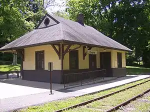 The current station was built in 1900 by the Philadelphia, Wilmington and Baltimore Railroad.[3] It was managed by the Pennsylvania Railroad after the companies merged, and was later taken over by SEPTA for SEPTA Regional Rail's R3 West Chester Line. SEPTA discontinued regular passenger service in September 1986, due to deteriorating track conditions and Chester County's desire to expand facilities at Exton station on the Paoli/Thorndale Line. Service was restored by the West Chester Railroad in 1997, a privately owned and operated heritage railway that operates between Glen Mills and West Chester on weekends.
