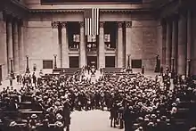 The architectural firm was D. H. Burnham & Company (known for its lead architect Daniel Burnham, who died before construction began). The successor firm of Graham, Anderson, Probst and White completed the work.[6] Work began on the massive project in 1913, and required purchasing adjacent properties and moving freight facilities. Construction stalled during World War I, and resumed in 1919.[7] The station finally opened on May 16, 1925, twelve years after construction began; some viaduct work continued into 1927. The construction cost, funded by the railroad companies involved, was projected to be $65 million, but ended up costing $75 million.[1] Construction was delayed several times by World War I, labor shortages and strikes. The construction of the station also involved the demolition and relocation of some previously existing buildings such as the Butler Brother's Warehouse along the Chicago River. It is one of about a dozen monumental Beaux-Arts railroad stations that were among the most complicated architectural programs of the era called the "American Renaissance", combining traditional architecture with engineering technology, circulation patterning and urban planning. Union Station was hailed as an outstanding achievement in railroad facility planning at the time.