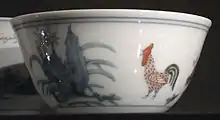 A Chicken Cup (Chenghua) is a bowl-shaped vessel made of Chinese porcelain painted in the doucai technique. Chicken cups were created during the Ming dynasty (1368 – 1644), during the Chenghua Emperor's reign (1465 – 1487) in China, and originally functioned as a vessel to drink wine from. Chenghua Chicken Cups were created in an imperial kiln in the Jingdezhen porcelain factory, in Southern China.[1] The Emperor Chenghua had the Chicken Cup created in the 15th century as an act of devotion for his empress mother who was recorded to have an appreciation for small objects and valued a simple design taste.[2]