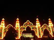Chiclana de la Frontera celebrates several festivals and feast days. Carnaval is held at the beginning of Lent the festival includes a parade and performances. The San Antonio Fair is held in mid June.[31] There is a parade and dancing in the stands, and an opportunity for women to wear local costumes. The celebration of Corpus Christi includes streets decorated with rosemary, incense and altars; there is also a religious procession.[32] The Festival of El Pilar celebrates the Virgen del Pilar, patron of the State Security Forces;[33] the icon is located in the Church of San Juan Bautista. Cruces de Mayo chiclaneras festival occurs in May with a procession. Typically, courtyards are decorated with flowers and religious symbols. The Festival of Parpuja occurs in August and consists of a gala attended by the leading national figures of flamenco such as José Mercé, Rancapino, and others.[34] Traditional foods are accompanied by wines from Chiclana.