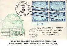 On November 22, 1935, it took off from Alameda, California in an attempt to deliver the first airmail cargo across the Pacific Ocean.[3] Although its inaugural flight plan called for the China Clipper to fly over the San Francisco–Oakland Bay Bridge (still under construction at the time), upon take-off the pilot realized the plane would not clear the structure, and was forced to fly narrowly under instead. On November 29, the airplane reached its destination, Manila, after traveling via Honolulu, Midway Island, Wake Island, and Guam, and delivered over 110,000 pieces of mail. The crew for this flight included Edwin C. Musick as pilot and Fred Noonan as navigator.[4] The inauguration of ocean airmail service and commercial air flight across the Pacific was a significant event for both California and the world. Its departure point is California Historical Landmark #968 and can be found in Naval Air Station Alameda.