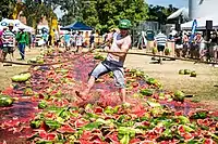 The Festival features interactive and unique events, such as Melon Skiing, Melon Bungee, Melon Bullseye, Melon Ironman, Melon Chariot, a pip spitting competition, and melon eating races. A special event held in 2009 saw John Allwood secure the Guinness World Record of Melon Head Smashing - cracking open as many watermelons as possible using only the head. Currently his record is 47 melons in a minute.[26]