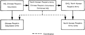 This is the order of battle for Chinese People's Volunteer Army during major periods of hostilities in the Korean War. After the People's Republic of China entered the Korean War in October 1950 by designating the People's Liberation Army (PLA) North East Frontier Force as the People's Volunteer Army (PVA),[1] the PVA spent the next two years and nine months in combat operations and five years and three months in garrison duties. Its last elements did not leave Korea until as late as 1958.[2]