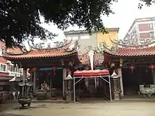 Another dimension of the Chinese folk religion is based on family or genealogical worship of deities and ancestors in family altars or private temples (simiao Chinese: 私廟 or jiamiao Chinese: 家廟), or ancestral shrines (citang Chinese: 祠堂 or zongci Chinese: 宗祠, or also zumiao Chinese: 祖廟).[126] Kinship associations or churches (zōngzú xiéhuì Chinese: 宗族協會), congregating people with the same surname and belonging to the same kin, are the social expression of this religion: these lineage societies build temples where the deified ancestors of a certain group (for example the Chens or the Lins) are enshrined and worshiped.[127] These temples serve as centres of aggregation for people belonging to the same lineage, and the lineage body may provide a context of identification and mutual assistance for individual persons.[127]
