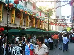 The Barrio Chino is a small Chinese enclave in Mexico City.[77] The Barrio Chino today is only two blocks along Dolores Street and extends only one block east and west of the street, with only seven restaurants and a few import businesses as of 2003.[47] The buildings in the Barrio Chino are no different from the rest of the city, but businesses here are either restaurants or importers. Most of the shops and restaurants here had abundant Chinese-style decorations and altars, but statues of the Virgin of Guadalupe and San Judas Tadeo (a popular saint in Mexico) can be seen as well.[78]
