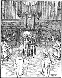 By 1449 recruitment had resulted in this full choir being in place singing daily services. The choir sang High Mass, Lady Mass and from daybreak, the eight services of the Liturgy of the Hours. In addition the boys alone sang daily "in the finest manner they know" the Little Office of the Blessed Virgin Mary and also the evening votive antiphon.[4]