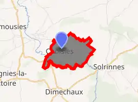 The arms of Choisies are blazoned : Ermine, on an inescutcheon sable semy of billets, a lion Or, armed and langued gules. |