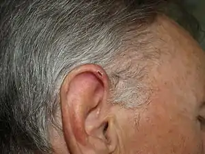 Chondrodermatitis nodularis chronica helicis is a small, nodular, tender, chronic inflammatory lesion occurring on the helix of the ear, most often in men.[2]:610