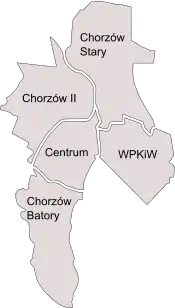 Administratively, Chorzów is in the Silesian Voivodeship since 1999, previously Katowice Voivodeship, and before then, the Silesian Voivodeship. Chorzów is one of the cities of the 2.7 million conurbation – the Katowice urban area and within a greater Silesian metropolitan area with the population of about 5,294,000 people.[2] The population within the city limits is 107,807 as of December 2019.[1]