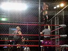 Angel's first title defense was a rematch against Vega in a steel cage match, which took place on January 6, 2011, as part of Histeria Boricua.[7] A storyline was run during the dead season, where Vega demanded the stipulation, noting that he had wins over wrestlers such as "Stone Cold" Steve Austin, Triple H and Dwayne "The Rock" Johnson. Angel retained in a contest that featured multiple false finishes and spots, including a dive from the top of the cage towards the challenger.[7] During the following three weeks, he was loosely involved in an angle with Rivera, while picking up a second successful defense over Edgar "Spectro" Rodríguez.[8] A championship match against Rivera was subsequently scheduled for an annual event titled Payback, where Angel retained following his finishing move.[9] A subsequent rematch concluded in the same manner. At Juicio Final, Angel added another former world champion to his undefeated record, defeating Roberto "La Amenaza" Rubio.[10] In that event, The Academy was merged into a new group, led by Ray González. He closed April by scoring another successful title defense.