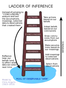 Argyris' collaborative work with Robert W. Putnam,[8] (not to be confused with Robert D. Putnam), and Diana McLain Smith[9] advocates an approach to research that focuses on generating knowledge that is useful in solving practical problems. Other key concepts developed by Argyris include ladder of inference, double-loop learning (Argyris & Schön 1974), theory of action/espoused theory/theory-in-use, high advocacy/high inquiry dialogue and actionable knowledge and the study of adult personality.