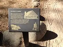The one story cabin measures 22 feet (6.7 m) by 37 feet (11 m) with a steep gable roof that extends beyond the front of the cabin to form a porch. The gable over the porch is decorated by a vertical log infill pattern, with a sleeping loft within. a massive stone fireplace dominates the left side elevation[2]