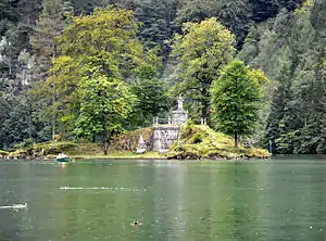 A well-known monument on the island is the statue of John of Nepomuk, patron of against the dangers of the water. The statue is about 180 cm high and made of marble. It stands on a hill in the northern portion of the island, on top of a pedestal about two meters high. The statue was erected in 1711 and donated by Johann Anton Zeitlmayer, director of chancellery and land judge of the Berchtesgaden Provostry, after all four passengers involved in a boat accident had been rescued. Since the erection of this statue, the island has also been called Johannesinsel (John's island or St. John's). It is believed that previously a statue of Apostle Bartholomew was at this location.
