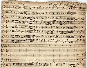 Graupner was hardworking and prolific. There are about 2,000 surviving works in his catalog, including 113 sinfonias, 85 ouvertures (suites), 44 concertos, 8 operas, 1,418 religious and 24 secular cantatas, 66 sonatas and 57 harpsichord partitas.[2] Nearly all of Graupner's manuscripts are housed in the ULB (Technical University Library) in Darmstadt, Germany.