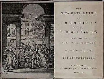 Commenting on the appearance of the Guide, published far away in Cambridge on the other side of the country by an unknown author, his son later marvelled that "It was hardly possible that a work of this description...could have made its appearance under circumstances of greater disadvantage."[25] The title was an added hindrance at first, since the third edition of the official city guide, now titled The New Bath Guide or useful pocket companion, had been published in 1765, the year before Anstey's work.[26] Though it provided a useful point of reference to readers, repeated editions of the pocket companion, 'corrected and much enlarged', continued to sow confusion for as long as the two books continued to appear.