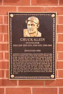 After retiring, he owned and operated a bar in Kensington, Philadelphia until 1947.[11] He endured some difficult financial times, largely due to a drinking problem. Eventually, a stroke damaged his nervous system and left one leg paralyzed. By 1947, Klein was living with his brother, and his wife in Indianapolis, Indiana.[11] He died there in 1958.[22] After never receiving more than 28% on the ballot, a campaign was started to get Klein elected to the Baseball Hall of Fame via the Veterans Committee.[23] Richard Nixon put Klein on his all time baseball team,[23] the campaigning worked, and Klein was elected to the Baseball Hall of Fame in 1980 via the Veterans Committee. In 1999, he ranked number 92 on The Sporting News' list of the 100 Greatest Baseball Players,[24] and was a nominee for the Major League Baseball All-Century Team.