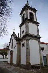 In the body of the nave (divided into two registers), there appears, on the first, an adjoining annex and in the upper two, arched windows.[1] The volume of the main chapel also includes an attached/adjoining annex and in the upper register, two straight windows, decorated by cornices.[1] The north facade, in the body of the nave, is a straight portal and half-cane frame surmounted by a protruding frieze and bowed arch with straight window, decorated by the coat-of-arms.[1] In the volume of the chancel, the sacristy appears with two straight windows, decorated with cornices. The blind eastern wall is topped by gable with cornice.[1]