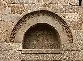At the front left of the chapel is the baptismal font made of granite in a simple circular form.[1] This baptistery is demarcated by an iron gate crowned in stylized fleur-de-lis. Alongside is a stone with inscription stating that the baptistery was used to baptize Afonso Henriques in 1106. Lateral porticos are carved into simple arches.[1] A full triumphal arch is decorated with frieze with interlocking ribbon motifs, while a cornice runs across the perimeter of the temple.[1]
