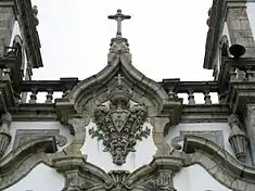 The frontispiece is flanked by two bell-towers, will corner pilasters and sectioned into three registers. The first register includes bay window and pediment; the second a clock; and the third register occupied by the bells.[2] These towers are crowned by bulbous vaulted-ceiling. The church porch is open to a segmented arch topped by large window bay, with monumental shoulders bound by pediment and interrupted by a royal coat-of-arms. On either side of the large window are two niches with sculptors.[2]