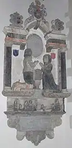Between these monuments is the demi-figure memorial to Phillip Vening, son of Phillip and Elizabeth Vening, who died in 1658 aged six and which is of coloured marble with inscriptions in black slate. He is shown leaning his head on his right hand, the right elbow being supported by a skull.[3]