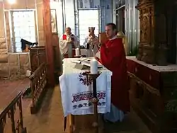 Following the Old Catholic and later Roman Catholic traditions, the vernacular is used during the liturgy with the exception of some Greek, Latin, and Spanish.