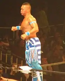 After fifteen successful defenses and a reign of 574 days, Cima lost the Open the Dream Gate Championship to Shingo Takagi on July 21, 2013.[14] During 2014, Cima won both the Open the Triangle Gate and Open the Twin Gate Championship alongside his Veteran-gun stablemates, but lost both titles in first defense.[15][16] On December 3, 2014, after losing the Open the Twin Gate Championship, Cima and Gamma were forced into joining the villainous Mad Blankey stable.[17] As part of the stable, Cima made unsuccessful attempts at recapturing the Open the Triangle Gate Championship.[15] Cima remained a part of Mad Blankey until May 5, 2015, when members of the stable turned on him, costing him a six-way steel cage match, as a result of which he was shaved bald.[18] On June 14, he, Don Fujii and Gamma defeated the Jimmyz (Genki Horiguchi H.A.Gee.Mee!!, Jimmy Susumu and Ryo "Jimmy" Saito) to win the Open the Triangle Gate Championship.[15] On October 8, Cima formed a new unit with Eita, Gamma, El Lindaman, Punch Tominaga, and rookies Kaito Ishida and Takehiro Yamamura.[19] On November 1, the unit was named Over Generation. The same day, he, Gamma, and Don Fujii defended the Open the Triangle Gate Championship against the Jimmyz (Jimmy Susumu, Jimmy K-Ness J.K.S., and Ryo "Jimmy" Saito), and vacated the title afterwards.[20] In the summer of 2016, Cima took part in the 2016 King of Gate, finishing with 6 points and failing to advance to the final.[21] Cima teamed up with Gamma once again for the Summer Adventure Tag League, making it to the semi finals where they lost to VerserK (Naruki Doi and Yasshi).[22] On November 3, Cima and Dragon Kid captured the Open The Dream Gate Titles, defeating Jimmy Kagetora and Jimmy Susumu in Osaka.[23] The two held the titles for over a year until they were forced to vacate them due to Dragon Kid suffering an injury. Cima found a new partner in Susumu, but the two were unsuccessful in defeating Eita and T-Hawk for the vacant titles at Final Gate in December 2017.[24]