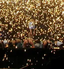 While performing on Good Morning America on December 2, 2008, Spears announced her fifth worldwide concert tour, titled The Circus Starring Britney Spears. She first revealed the first leg of twenty-five dates in the United States and two in the United Kingdom. Her longtime manager Larry Rudolph stated that the tour would "blow people's minds and promises to show Britney's fans something they will never forget",[54] later adding, "she goes full-speed the whole show — about an hour and a half. It's pretty intense. This is a full-blown, full-out Britney Spears show, It is everything everybody expects from her — and more!"[55] Spears also expressed excitement in including songs from Blackout into the setlist, as she didn't tour to promote it.[7] The tour began on March 3, 2009 in New Orleans' New Orleans Arena and finished on November 29, 2009 in Adelaide's Adelaide Entertainment Centre. There were four legs of the tour, visiting North America twice, and others being Europe and Australia.[56] The stage was composed of three rings and set in-the-round to resemble an actual circus. Fashion designers Dean and Dan Caten created the costumes. A giant cylinder screen was set above the stage to showcase videos and backdrops. Effects were provided by Solotech. The setlist was composed generally from her albums In the Zone, Blackout and Circus. In June 2009, Spears announced she would tour Australia for the first time; she was also rumored to tour South America, though her manager Adam Leber denied this despite their efforts to do so.[57]