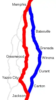 - Yazoo and Mississippi Valley Railroad (IC), Memphis to Jackson, Mississippi, now CN