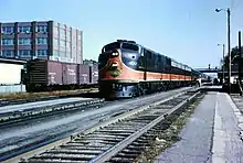 The Illinois Central Railroad introduced the original City of New Orleans on April 27, 1947. It was a daytime, all-coach companion to the overnight Panama Limited, which had been all-Pullman for most of its run. EMD E7 diesel locomotives pulled new lightweight Pullman Company coaches. The 921-mile (1,482 km) route, which the City of New Orleans covered in 15 hours 55 minutes, was the longest daytime schedule in the United States.[2][3] The City of New Orleans exchanged St. Louis—New Orleans through cars at Carbondale, Illinois and Louisville—New Orleans cars at Fulton, Kentucky. The average speed of the new train was nearly 60 mph (97 km/h) with a maximum of 100 mph (160 km/h); a result of the largely flat route of the Illinois Central along the Mississippi River.[4][5] By October 25, 1959, the timetable had lengthened to 16 hours 30 minutes.[6] The train remained popular throughout the 1960s and gained ex-Missouri Pacific Railroad dome coaches in 1967.[4]