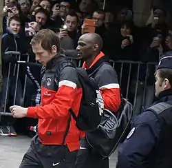 Chantôme pictured with Zoumana Camara leaving their hotel in preparation for a match for Paris Saint-Germain.