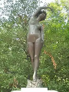 In St. Louis three of Garrett's large pieces could be seen at the Mary Institute, the Eugene Field School and McKinley High School. A fourth, posed by a St. Louis girl and named Carrie Kingsbury or Awakening of Spring (1902),[5] stands still today at the entrance of Kingsbury Place adorning the Union Boulevard gateway.[4] The Kingsbury piece took two years of work to Garrett and once unveiled, the sensual nudity of the girl caused such an uproar that Garrett used the $7000 ($206,850 in 2019 dollars) compensation to move to Paris. A number of smaller pieces were in many of St. Louis' finest homes. She was splendidly remunerated, busts bringing her $1,000 ($25,525 in 2019 dollars), and other pieces in proportion.