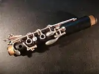 Clarinet bodies have been made from a variety of materials including wood, plastic, hard rubber, metal, resin, and ivory.[33] The vast majority of clarinets used by professionals are made from African hardwood, mpingo (African Blackwood) or grenadilla, rarely (because of diminishing supplies) Honduran rosewood, and sometimes even cocobolo.[34] Historically other woods, notably boxwood, were used.[34] Most inexpensive clarinets are made of plastic resin, such as ABS.[34] Resonite is Selmer's trademark name for its type of plastic. Metal soprano clarinets were popular in the early 20th century until plastic instruments supplanted them;[35] metal construction is still used for the bodies of some contra-alto and contrabass clarinets and the necks and bells of nearly all alto and larger clarinets.[36] Ivory was used for a few 18th-century clarinets, but it tends to crack and does not keep its shape well.[37] Buffet Crampon's Greenline clarinets are made from a composite of grenadilla wood powder and carbon fiber.[38] Such clarinets are less affected by humidity and temperature changes than wooden instruments but are heavier. Hard rubber, such as ebonite, has been used for clarinets since the 1860s, although few modern clarinets are made of it. Clarinet designers Alastair Hanson and Tom Ridenour are strong advocates of hard rubber.[39][40] The Hanson Clarinet Company manufactures clarinets using a grenadilla compound reinforced with ebonite, known as BTR (bithermal-reinforced) grenadilla. This material is also not affected by humidity, and the weight is the same as that of a wooden clarinet.