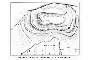 The first evidence of permanent structures on Clatchard Craig date to the Dark Ages. While occupied as a fortress, it consisted of a series of six ramparts surrounding a building on the summit of the hill.[1] It comprised three main structural phases, the latest being the sub-rectangular enclosure on top, which measured 230 feet (70 m) by c. 115 feet (35 m), from which relics of early medieval date were obtained. This stood within a heavy oval rampart, 330 feet (100 m) by 200 feet (61 m). The next rampart overlay a series of hearths in which pottery was found, and in this rampart were masonry blocks with adherent mortar in which were fragments of tile. The third rampart, like the two preceding, was timber-laced, later replaced by earth and stone. There were a further two ramparts with minor additions and supplementary features. The earliest two ramparts, built in timber-laced stone were dated to the sixth century AD by radiocarbon dating. Construction of the ramparts continued throughout the era with pieces of recycled Roman tile and mortared masonry included in the fabric.[1][6] The fort's walls were vitrified at some point suggesting that the site had once been destroyed by fire. A date cannot be ascribed to either the burning of the fort nor its abandonment.[1][6]
