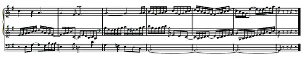 Examination of the original manuscript suggests that the Kyrie-Gloria and larger catechism chorale preludes were the first to be composed, followed by the "St Anne" prelude and fugue and the manualiter chorale preludes in 1738 and finally the four duets in 1739. Apart from BWV 676, all the material was newly composed. The scheme of the work and its publication were probably motivated by Georg Friedrich Kauffmann's Harmonische Seelenlust (1733–1736), Conrad Friedrich Hurlebusch's Compositioni Musicali (1734–1735) and chorale preludes by Hieronymus Florentinus Quehl, Johann Gottfried Walther and Johann Caspar Vogler published between 1734 and 1737, as well as the older Livres d'orgue, the French organ masses of Nicolas de Grigny (1700), Pierre Dumage (1707) and others.[10][11] Bach's formulation of the title page follows some of these earlier works in describing the particular form of the compositions and appealing to "connoisseurs", his only departure from the title page of Clavier-Übung II.[12]