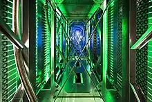 In the data center shown the rooms serve as cold corridors, there is a raised floor but there are no perforated tiles. Cooling occurs in closed corridors with rows of racks on both sides while cooling coils using cold water serve as the ceiling of these warm corridors, which also house the pipes that carry the water to and from the cooling towers housed in another part of the building.