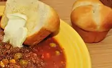 A Cloverleaf roll is an American[1] type of bread roll consisting of three separate sections.[2] It is named after the leaf of the clover plant, which has three lobes.[2] They are made by placing three small balls of dough in the cups of a muffin tin; as the dough proofs and bakes, the cloverleaf pattern is formed.[2] After baking, they are easily pulled apart.[3] "Cloverleaf roll" refers to a shape, not a specific recipe: many recipes lend themselves to the cloverleaving process.[4]