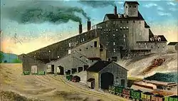 The modern coal breaker can be traced to 1844.[4] Joseph Battin, a supervisor at a coal gas manufacturing plant in Philadelphia, Pennsylvania, invented the first coal breaker—two cast iron rollers (one with teeth, one with holes to accept the teeth) through which the coal was crushed before it rolled down a chute and then through an inclined cylindrical screen.[9] The screen had a mesh which was fine toward the front and became progressively less so toward the end.[4] Larger chunks of coal, falling inside the cylinder as it rotated, broke up and eventually passed through the screen.[4][9] Impurities, which were heavier, tended to exit the breaker at the end of the screen.[4] The sorted coal would then be collected in bins below the screen, and transported to market.[9] A fellow Pennsylvanian, Gideon Bast, licensed the technology from Battin, and erected the first commercial coal breaker in Schuylkill County, Pennsylvania, on February 28, 1844.[4][9] A number of coal processing machines—such as rollers, crushers, washers, and screens—were developed in Europe and later utilized in the United States.[1] By 1866, the coal breaker in the United States had taken the form most recognized today, with multiple stories and numerous screening processes and mechanical sorting devices.[14] The first steam-powered shaking screens were used in the U.S. 1890, and the first steam-powered coal washers installed in 1892.[1]