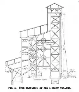 By the year 1893, the Delaware & Hudson Canal Co. was operating the colliery, producing 219,044 tons of coal. However, on November 15, 1894, the first No.3 breaker burned. The headline in the Wilkes-Barre Times read, "A glorious scene – the whole valley lighted up and glare seen in Scranton – will be re-built at once."[87] In January 1895, the new breaker at the No. 3 was under construction,[88] designed by Abram Shaffer; it began operating on June 1, 1895. According to the newspapers, it was clad in corrugated iron and had a "fine appearance."[89] By 1916, the Delaware & Hudson decided to abandon the No. 3 breaker and run coal from the mine through the company's No. 5 breaker, and on the morning of December 2, the No. 3 breaker was destroyed by fire.