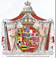 William decreed new arms on 16 August 1873. The number of quarters was again 48 with three escutcheons. Added were the collars of the Order of the House of Hohenzollern and the Order of the Prussian Crown. The motto was placed on the dome of the pavilion.