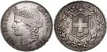 In the 1850 series of the Swiss franc coins, the small denominations (1, 2, 5, 10 and 20 centimes) had a coat of arms with floral ornaments, while the larger denominations (½, 1, 2 and 5 francs) showed a seated Helvetia figure holding a triangular shield on which the Swiss cross was displayed within an oval shape. The coat of arms in the denominations 5, 10 and 20 centimes was replaced by a female head (Liberty) in 1881. In the 1 and 2 centimes coins, the coat of arms was replaced by a simple Swiss cross in 1948. For the ½, 1, and 2 francs coins, the seated Helvetia was replaced by her standing figure in 1875. The 1888 five franks coin showed a coat of arms with a heraldic shield in a shape inspired by Baroque cartouche designs. The 1922 design of the five franks coin introduced a simplified shield of the rounded "Iberian" type.