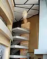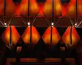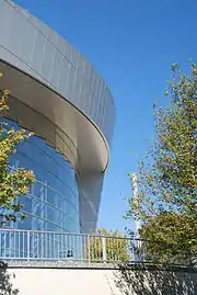 The asymmetrical top of the building rises above the multi-story glass facade that allows views of the grand alabaster staircase and lobbies beyond when lit at night.[6] The rising waves were meant to soften the transition to the fly tower required over the stage.[5] Just inside the entrance, visitors are greeted by the commissioned mural The Nine Muses by Jimmy O'Neal.[6] The chandeliers in the main lobby[5] and those in the ballroom are the Nastro designed by Tobia Scarpa and made by Andromedamurano.[6] The interior throughout the Centre makes extensive use of traditional theater colors such red and gold as well as dark wood finishes. The Cobb Energy Performing Arts Centre is the only performing arts center in memory to be completed within schedule and budget.[6]