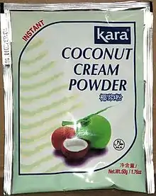 Coconut milk powder is a fine, white powder used in Southeast Asian and other cuisines. Coconut milk powder is manufactured through the spray drying process of raw unsweetened coconut cream and is reconstituted with water for use in recipes that call for coconut milk. Many commercially available coconut milk powders list milk or casein among their ingredients.[1]