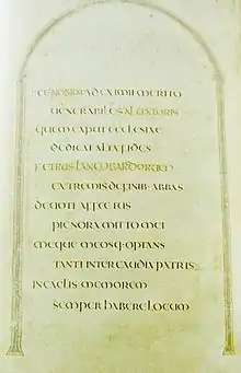 Designated by siglum A, it is commonly considered to provide the most reliable surviving representation of Jerome's Vulgate text for the books of the New Testament, and most of the Old Testament. As was standard in all Vulgate bibles until the 9th century,[3] the Book of Baruch is absent as is the Letter of Jeremiah, the text of the Book of Lamentations following on from the end of Jeremiah without a break.[4][2] Ezra is presented as a single book, the texts of the later canonical books of Ezra and Nehemiah being continuous. Similarly the books of Samuel, Kings and Chronicles are each presented as a single book.[5]