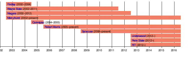 The 2011–12 academic year and season brought many changes to the CHA. Wayne State abruptly ended their women's hockey program, dropping conference membership to only four teams again for the 2011–12 season.[5] The conference announced that Lindenwood University would officially join the CHA for the 2012–2013 season.[6] Lindenwood, then in the process of transitioning its athletic programs from the NAIA to the NCAA, had already been slated to play ten games against CHA opponents in its first season of NCAA competition as an independent program for the 2011–12 season.[7] On March 19, 2012, Niagara announces it was dropping its women's ice hockey program effective immediately; as a result, the Rochester Institute of Technology team was allowed to immediately join the CHA upon its move from D-III to D-I for the 2012–13 season.[8][9] Penn State, which had announced it would upgrade its men's and women's hockey from club to NCAA Division I status for 2012, was accepted for admission to the CHA for the 2012–13 season.[10] In sum, the CHA continued as a women's-only conference for the 2012–13 season and beyond with a total of six teams consisting of Mercyhurst (original member from 2002); Robert Morris (joined 2005); Syracuse (joined 2008) and new members Penn State, Lindenwood and RIT.[8]