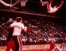 For a brief period during the early 1980s, the Colonel also joined members of the Rebel cheerleading squad in traveling to several NBA games to perform at halftime shows, in which the group would use mini-trampolines and perform flashy, acrobatic slam-dunks and other basketball stunts. (This group, which featured Colonel Reb in its earliest performances, was originally known as the "Dixie Daredevils," but it eventually rebranded as the "Bud Light Daredevils" after obtaining a sponsorship from Budweiser.)[14]