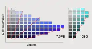 As colorfulness, chroma, and saturation are defined as attributes of perception, they can not be physically measured as such, but they can be quantified in relation to psychometric scales intended to be perceptually even—for example, the chroma scales of the Munsell system. While the chroma and lightness of an object are its colorfulness and brightness judged in proportion to the same thing ("the brightness of a similarly illuminated area that appears white or highly transmitting"), the saturation of the light coming from that object is in effect the chroma of the object judged in proportion to its lightness. On a Munsell hue page, lines of uniform saturation thus tend to radiate from near the black point, while lines of uniform chroma are vertical.[7]