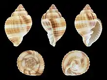 Five views of a shell of Cancellaria reticulata Linnaeus, 1767