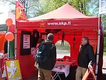The SKP has made electoral coalitions with other small parties, especially the Communist Workers Party (KTP). Communist League members were on SKP lists before they in 2006 founded the Workers Party of Finland (STP). The SKP condemned the STP for scattering communist forces.[9] The parties have made some limited electoral cooperation since. The Left Alliance has never been interested in coalitions with the communists,[10] although the parties have had coalitions in few municipalities.